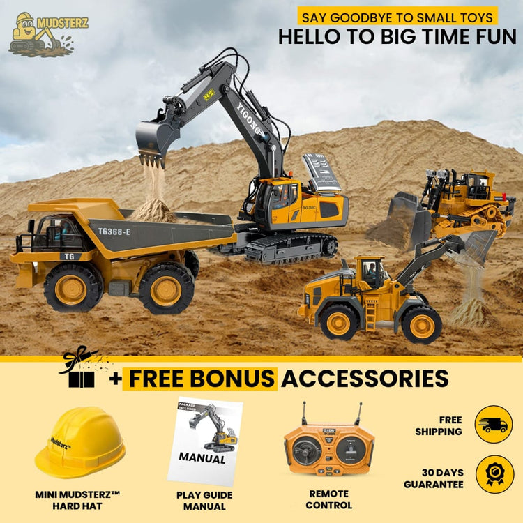 Unleash epic construction fun with Mudsterz™ RC machines. Four vehicles, realistic sounds, LED headlights and a 20-minute runtime—perfect for backyard or living room adventures.