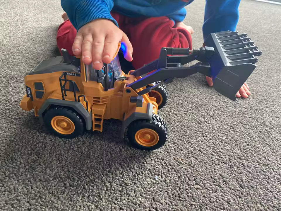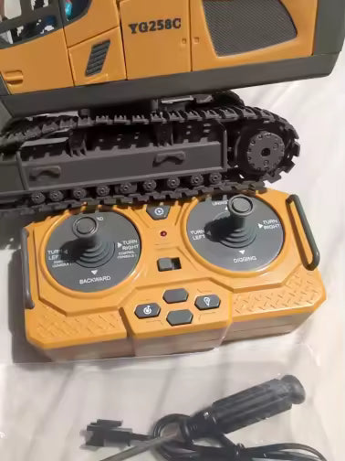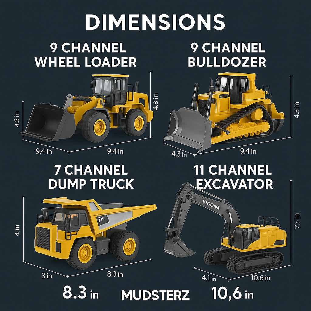Four RC machines—excavator, dump truck, bulldozer, loader. Rechargeable batteries, LED lights, realistic engine sounds, and easy assembly for kids 5 and up.